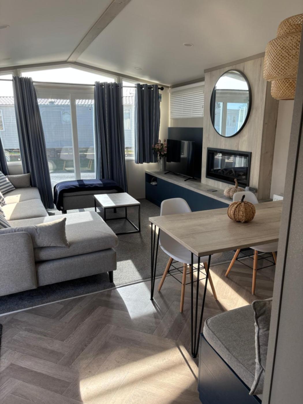 Caravan. A seating area with a flat-screen TV, a tea and coffee maker and outdoor furniture are featured in this mobile home. The unit offers 3 beds.
